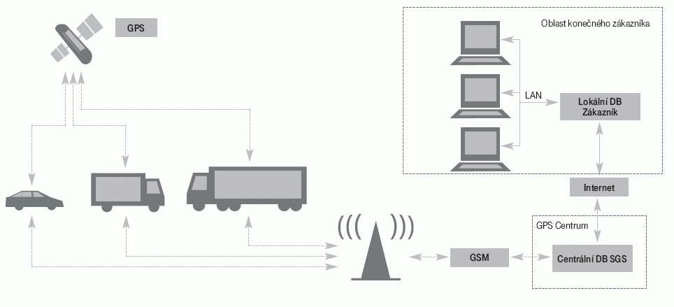 Jednotka GPS ve vozidle nepřetržitě snímá polohu vozidla (GPS –Globální Poziční Systém) a je schopna tuto polohu okamžitě odesílat na centrální systém (GPS Centrum). Interval odesílání polohy lze nastavit. V případě, že není možné uskutečnit spojení, uchovávají se informace o poloze v paměti jednotky a k jejich odeslání dojde ihned po sestavení spojení. Jednotka je osazena vstupy a výstupy pro napojení na některé elektrické okruhy automobilu, jako jsou zapalování, alarm, imobilizér, atd. Uživatelský přepínač slouží k indikaci provozního stavu vozidla. U firemních vozidel k rozlišení Firemní/Soukromá jízda, u privátních vozidel Povolená/Nepo­volená.